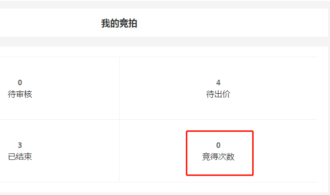 競(jìng)標(biāo)結(jié)束后,在“會(huì)員中心”里查看竟得次數(shù),如果中標(biāo),竟得次數(shù)會(huì)有顯示數(shù)字,沒有中標(biāo)則顯示“0”