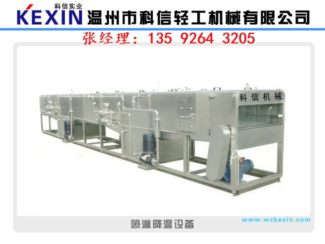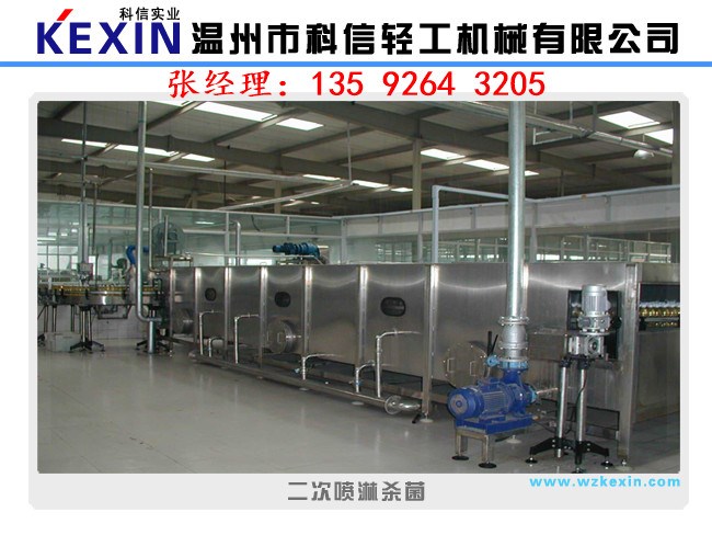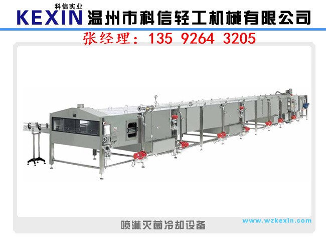 由輸送帶傳送過(guò)來(lái)的包裝瓶在設(shè)備入口處排瓶,順序進(jìn)入溫區(qū)預(yù)升溫85°C,然后進(jìn)入第二溫區(qū)滅菌溫15分鐘,第三和四、五溫區(qū)逐漸降溫,在出口部分設(shè)有凈水噴淋,出口溫度達(dá)到35℃。